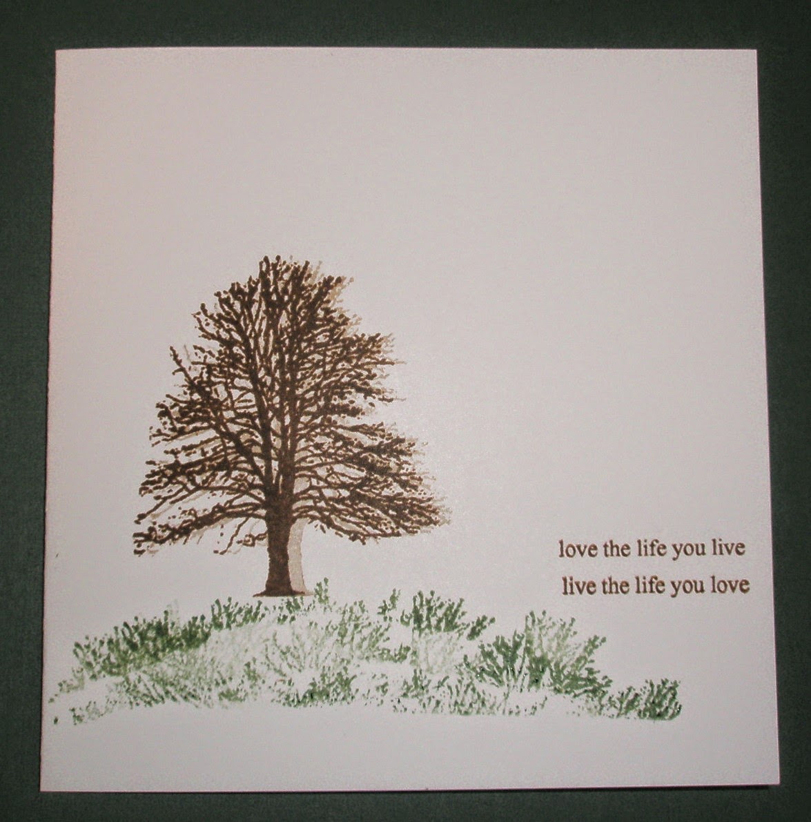 I love this technique and decided to do a tree on a grassy knoll. I've used a Beech Tree (Oak House Studio) stamp inked with Potting Soil Archival and stamped twice which gives the tree a little more depth. I've used the same stamp on it's side for the grass - using Meadow Adirondack, a piece of torn paper for masking and stamping twice. It's just finished with the sentiment from Oak House Studio too.